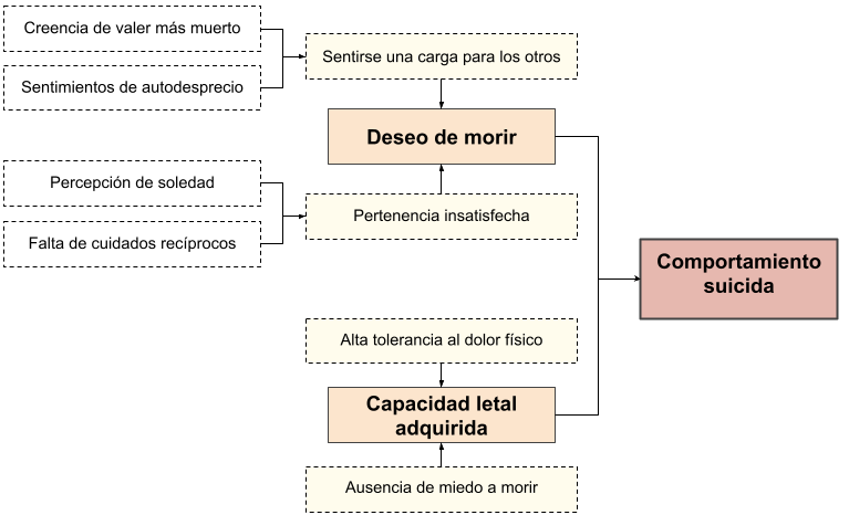 En Why People Die by Suicide, Thomas Joiner postula la teoría interpersonal del suicidio , una explicación del suicidio en tres partes que se centra en el deseo de morir y en la capacidad letal. El deseo de morir por suicidio proviene de una sensación de desconexión de los demás y falta de pertenencia, combinada con la creencia de que uno es una carga para los demás. La **capacidad de letal*, aquella capacidad de morir por suicidio proviene de una desensibilización gradual a la violencia y una disminución del miedo al dolor, combinada con competencia técnica en uno o más métodos de suicidio. Bajo este modelo, una combinación de deseo y habilidad precederá a los intentos de suicidio más serios: