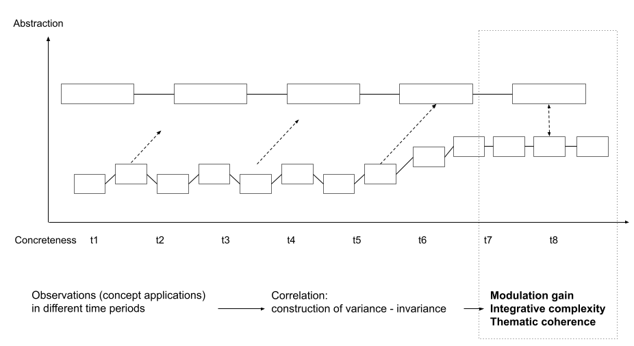 A través de una gradual integración de diferenciaciones más abstractas (sustentadas en las aplicaciones concretas del problema terapéutico), se espera un gradual aumento de complejidad integrativa. Esto equivale a un cambio cualitativo en la experiencia, caracterizada por mayor abstracción, capacidad de flexibilizar los puntos de vista sobre la experiencia, mayor alternativismo constructivo, etcétera.